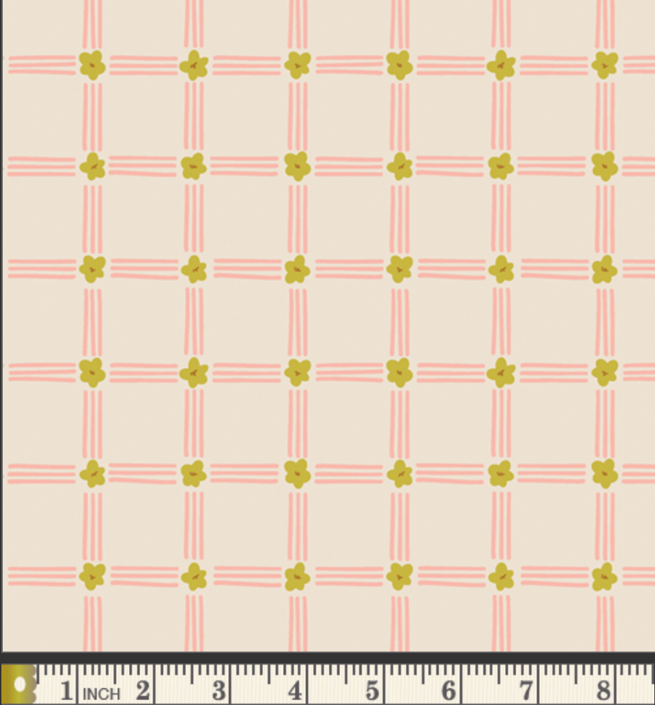 A grid of pink stripes dotted with golden blooms brings structure with softness.