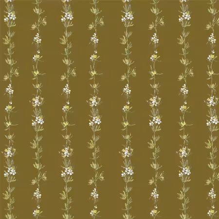 This fabric features a charming design of olive climbing vines, with delicate white flowers and green leaves set against a rich brown background. The pattern is arranged in vertical rows, creating a sophisticated and elegant look that is perfect for a variety of sewing projects, from home decor to fashion garments. The fabric's 100% cotton composition ensures comfort, breathability, and ease of care, making it a versatile choice for both professional designers and home sewers.