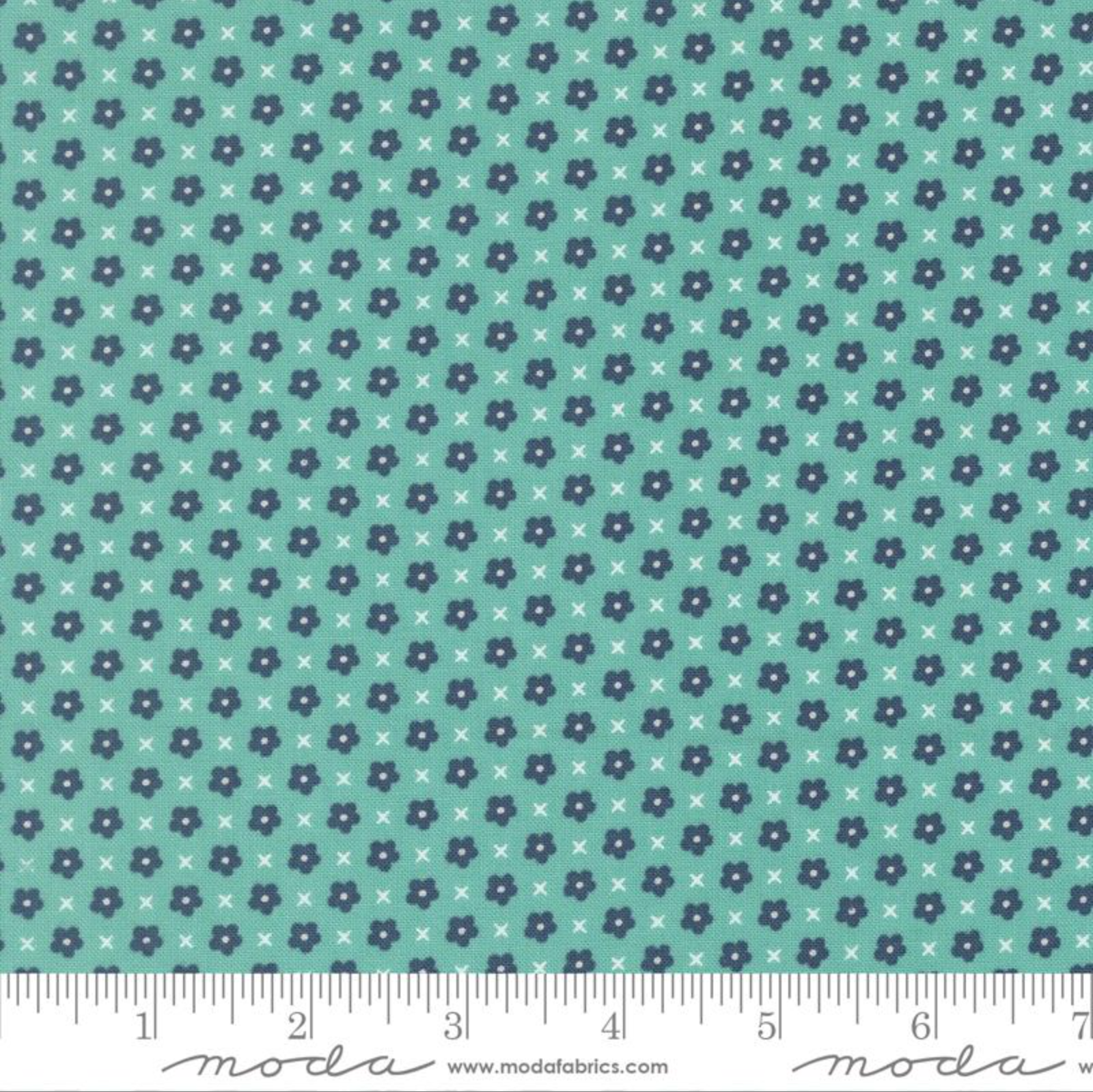 Tiny navy blossoms and delicate “x” accents scatter across a refreshing aqua backdrop, giving off a retro, playful vibe.