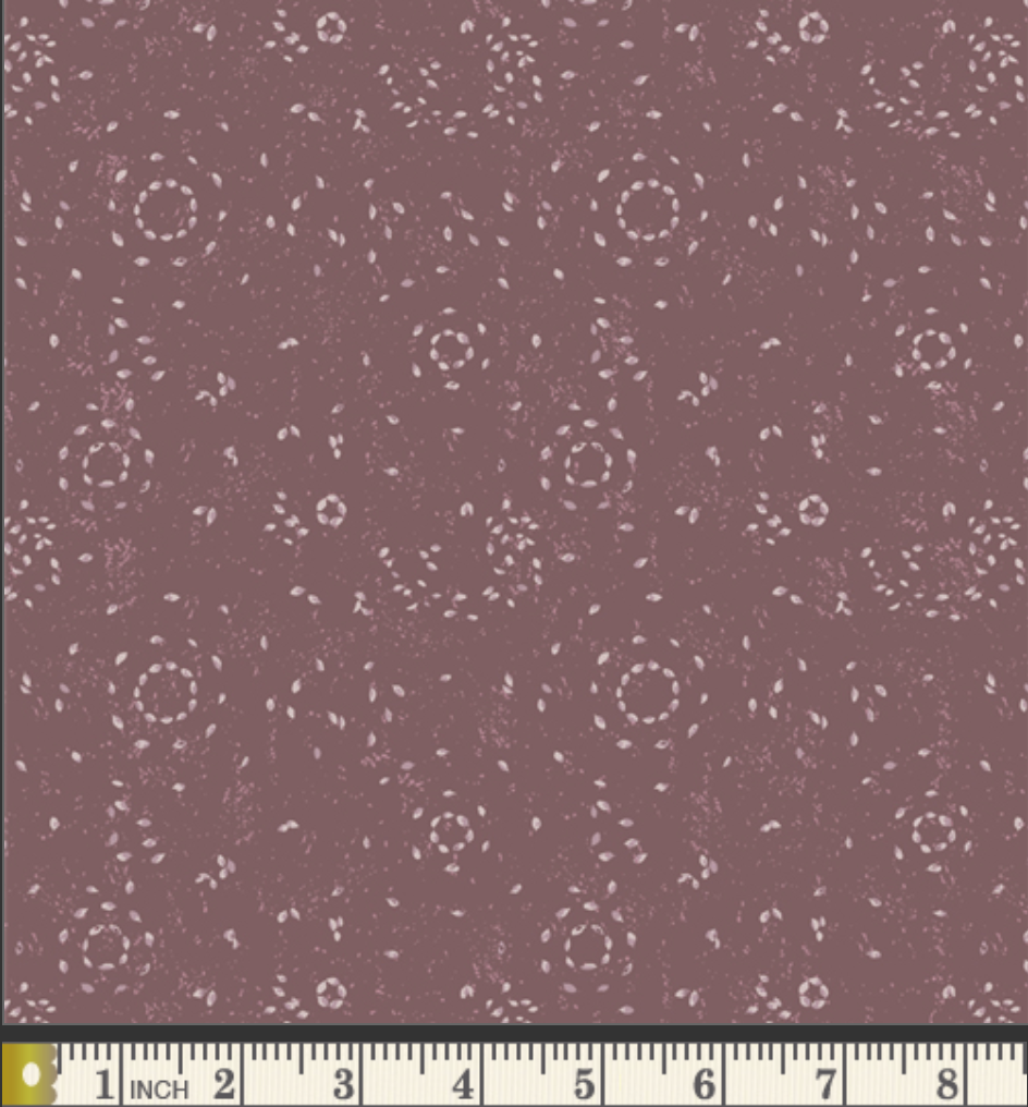 Textured dots repeat in a subtle plum palette with a hand-stamped feel.