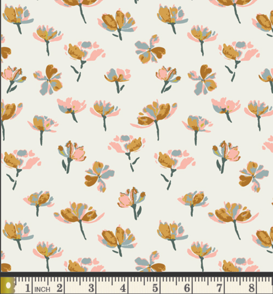 Loose, brushstroke florals in warm mustard, rose, and soft blue dance across ivory for a hand-painted charm.