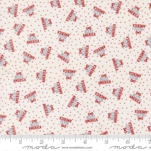 This fabric features a fun "God Bless America" script and tiny dots across a soft vanilla background in a cheerful red, white and blue colorway