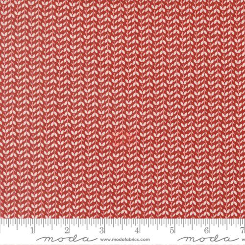This fabric features a vertical vine stripe with small leaves in classic white on a red background