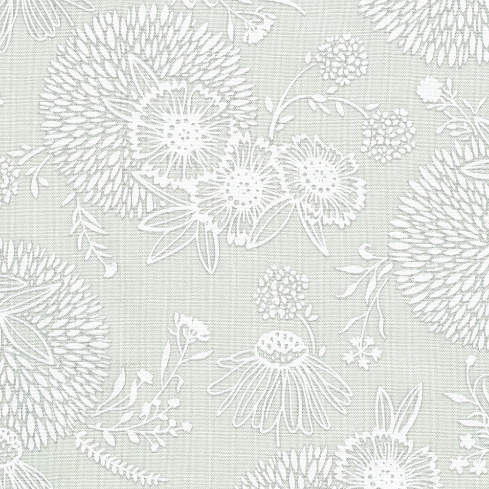 Soft and subtle, this fabric features delicate floral bursts and leafy silhouettes in a light tone on tone design. Its neutral palette makes it a perfect blender or background fabric. This piece is light grey with white flowers