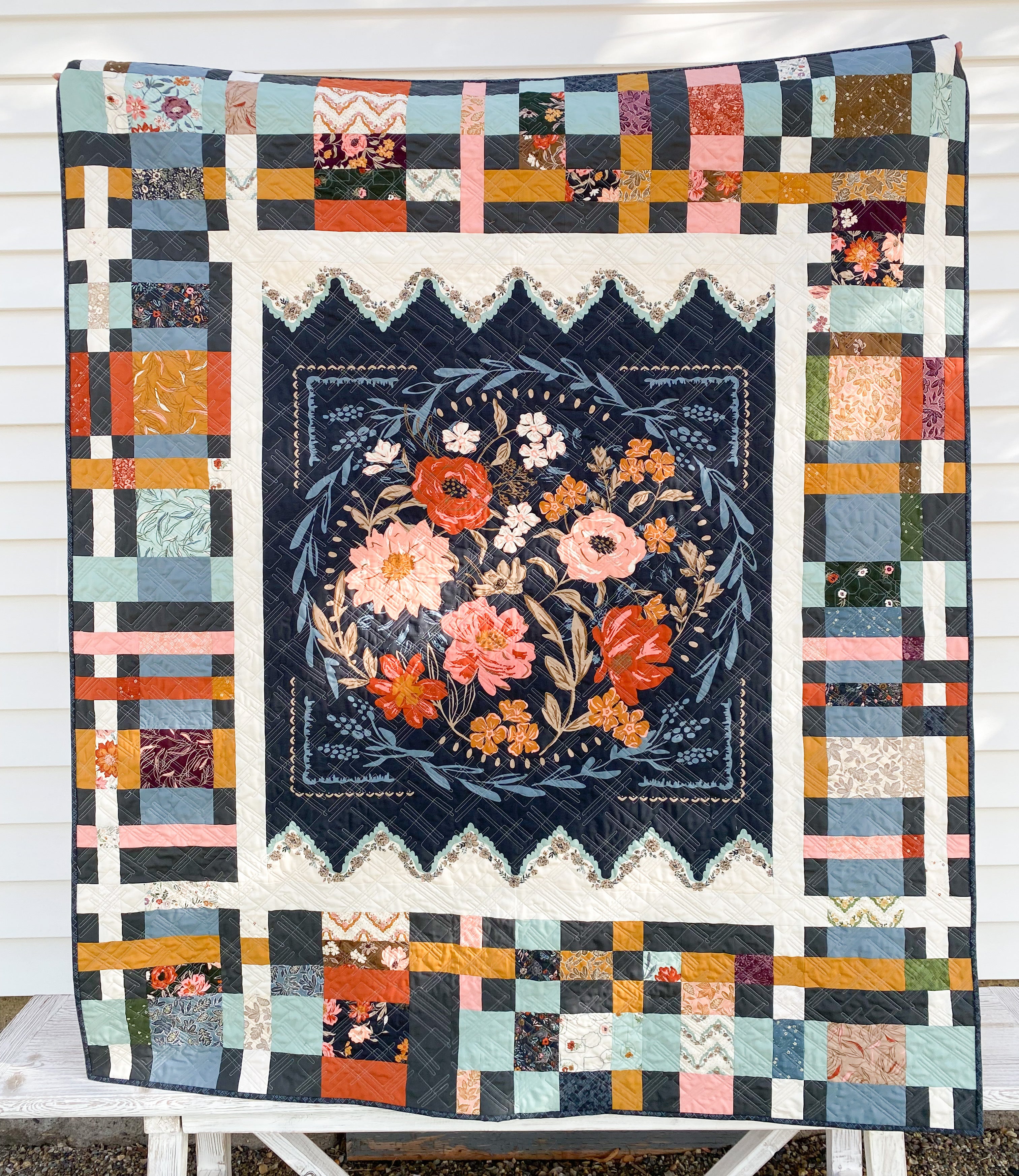 The kit includes the Foraged, Found, & Hand Me Down fabric collection by Moda—beautifully arranged to recreate the bold center floral panel and the intricate patchwork borders that make this quilt a true showpiece. Whether draped over a couch, displayed on a wall, or gifted to someone special, this quilt will become a treasured hand-me-down in its own right.