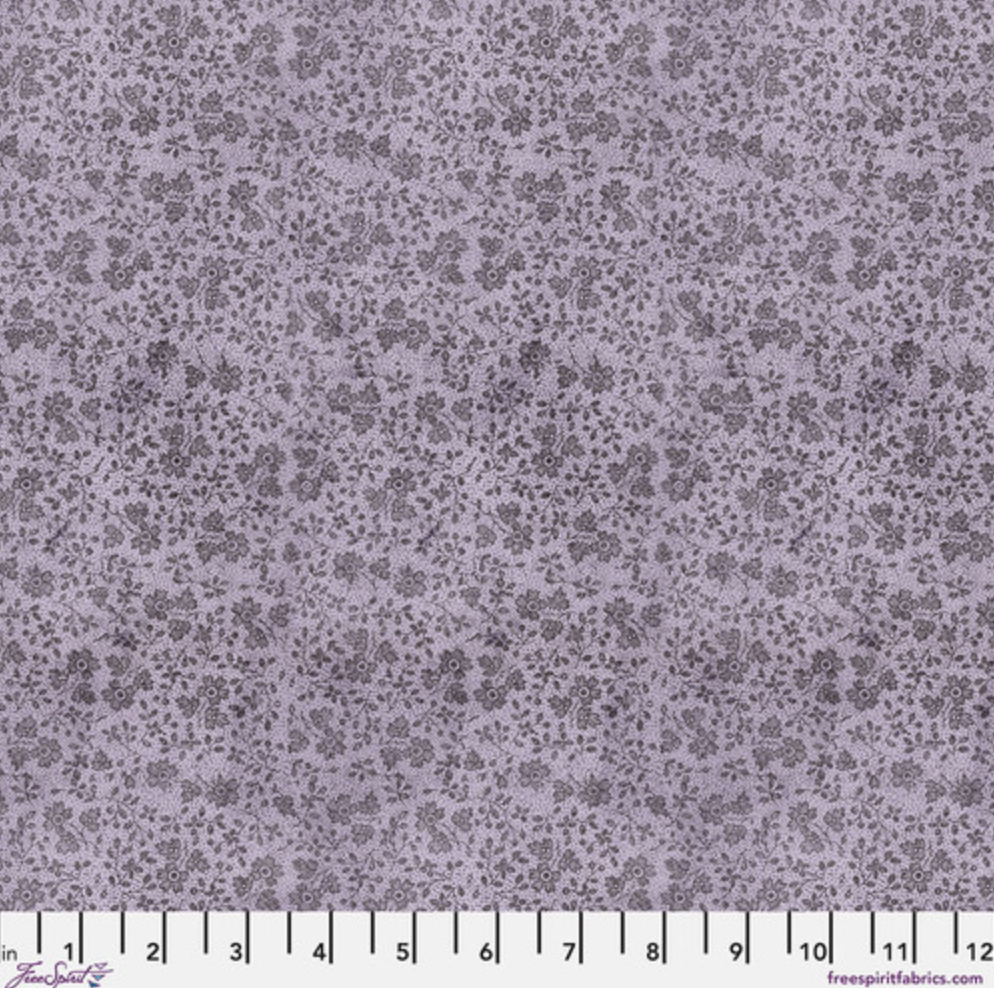 Tiny, detailed floral motifs in tonal purple shades create a soft blender that works beautifully with bold prints or as a quiet background.