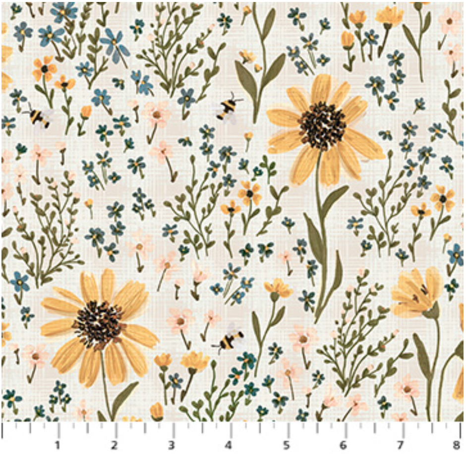 Step into a blooming meadow alive with the hum of busy bees and wildflowers swaying in the breeze. Humblebee is a celebration of nature’s quiet magic—sun-kissed blossoms, golden honeycombs, gentle checks, and sprigs of meadow greens. With soft pastels, earthy tones, and a touch of whimsy from buzzing bees, this collection brings the joy of summer fields into your quilting. Perfect for cottage-style quilts, picnic throws, or projects that feel like a warm day outdoors.