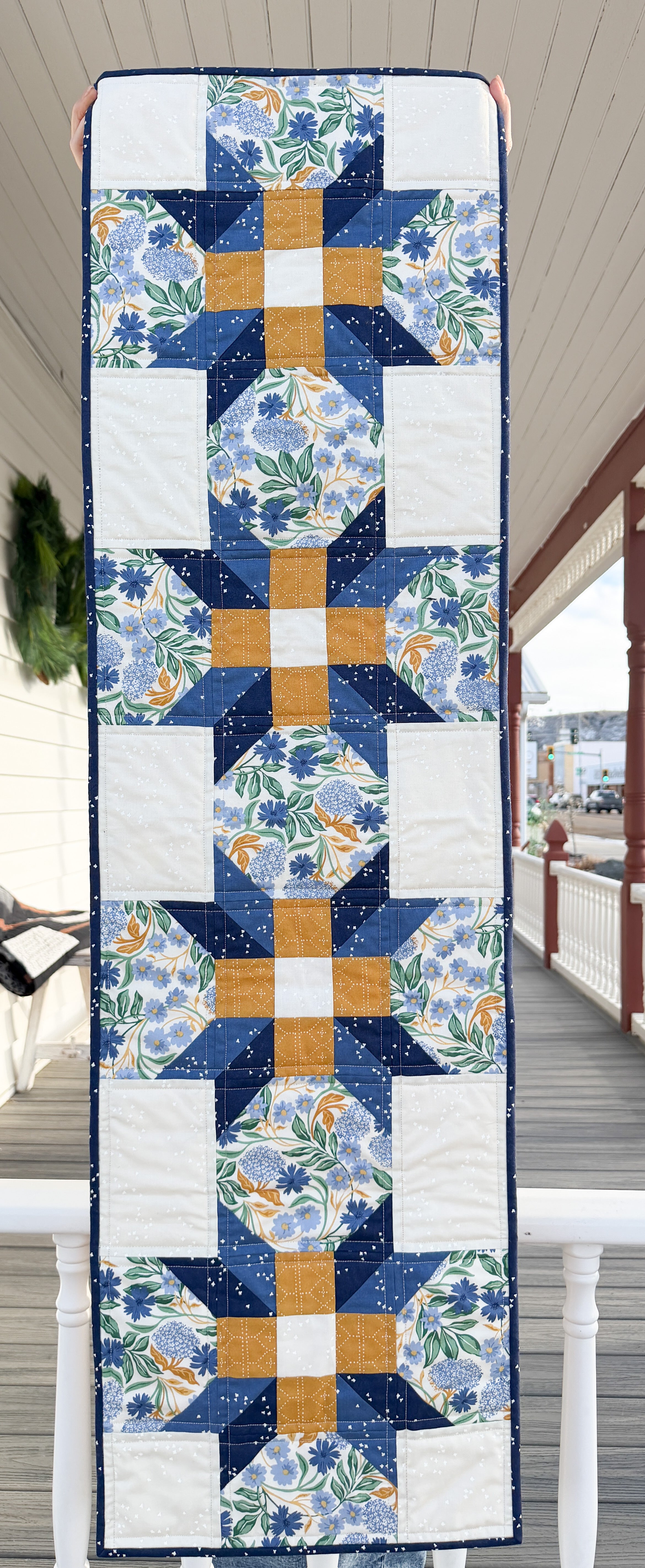 Add timeless charm to your table with this beautiful table runner. Featuring a bold geometric design in navy, ivory and warm golden tones, this piece is accented with soft floral prints from the Brookside collection designed by 1 Canoe 2 from Moda