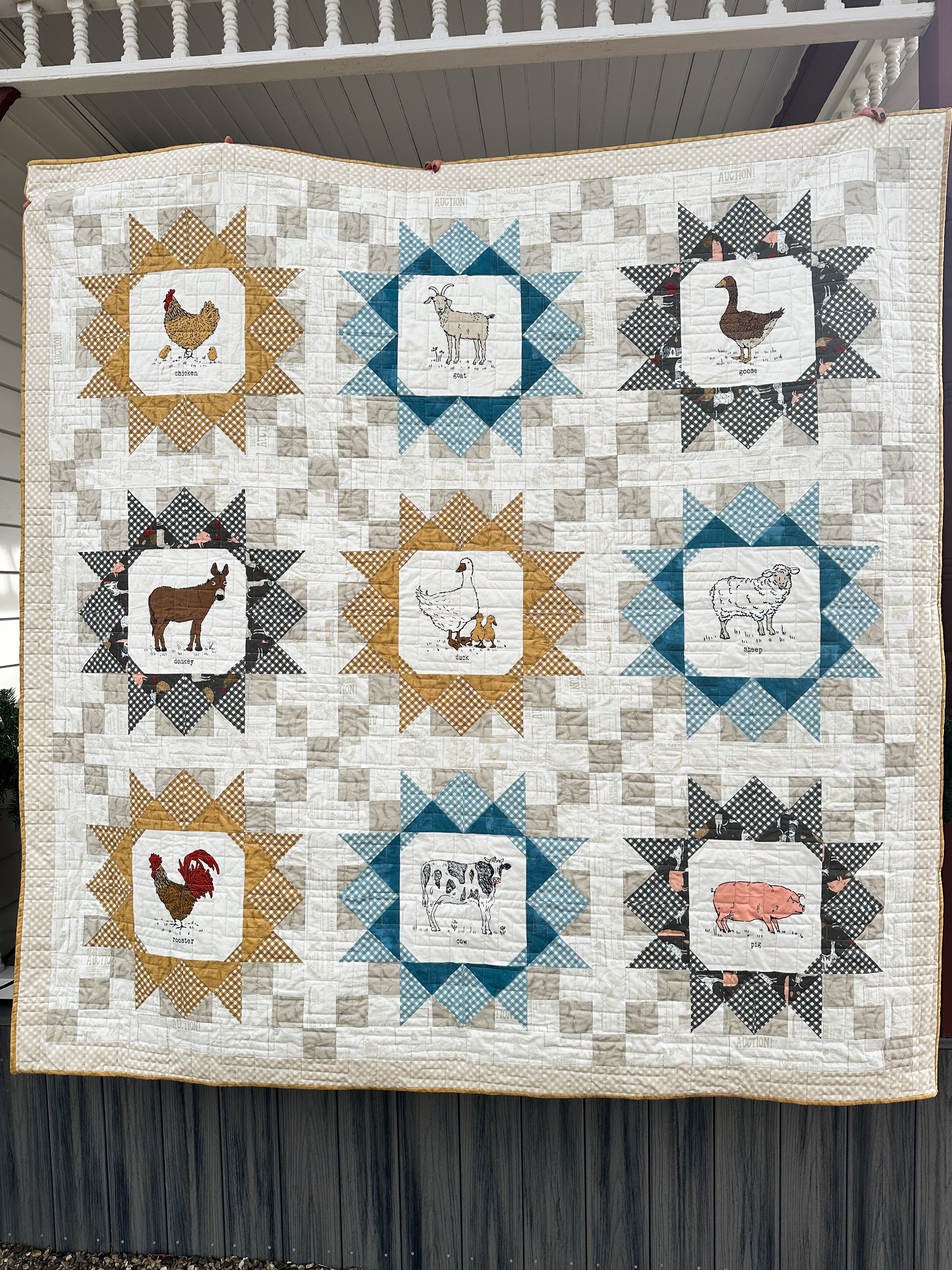 Bring the charm of the barnyard straight into your sewing room. Farmstead features adorable illustrated animals framed in vibrant sawtooth stars — goats, cows, pigs, roosters, and more. Soft neutrals pair with mustard, teal, and black prints for a down-to-earth palette that feels cozy and cheerful.