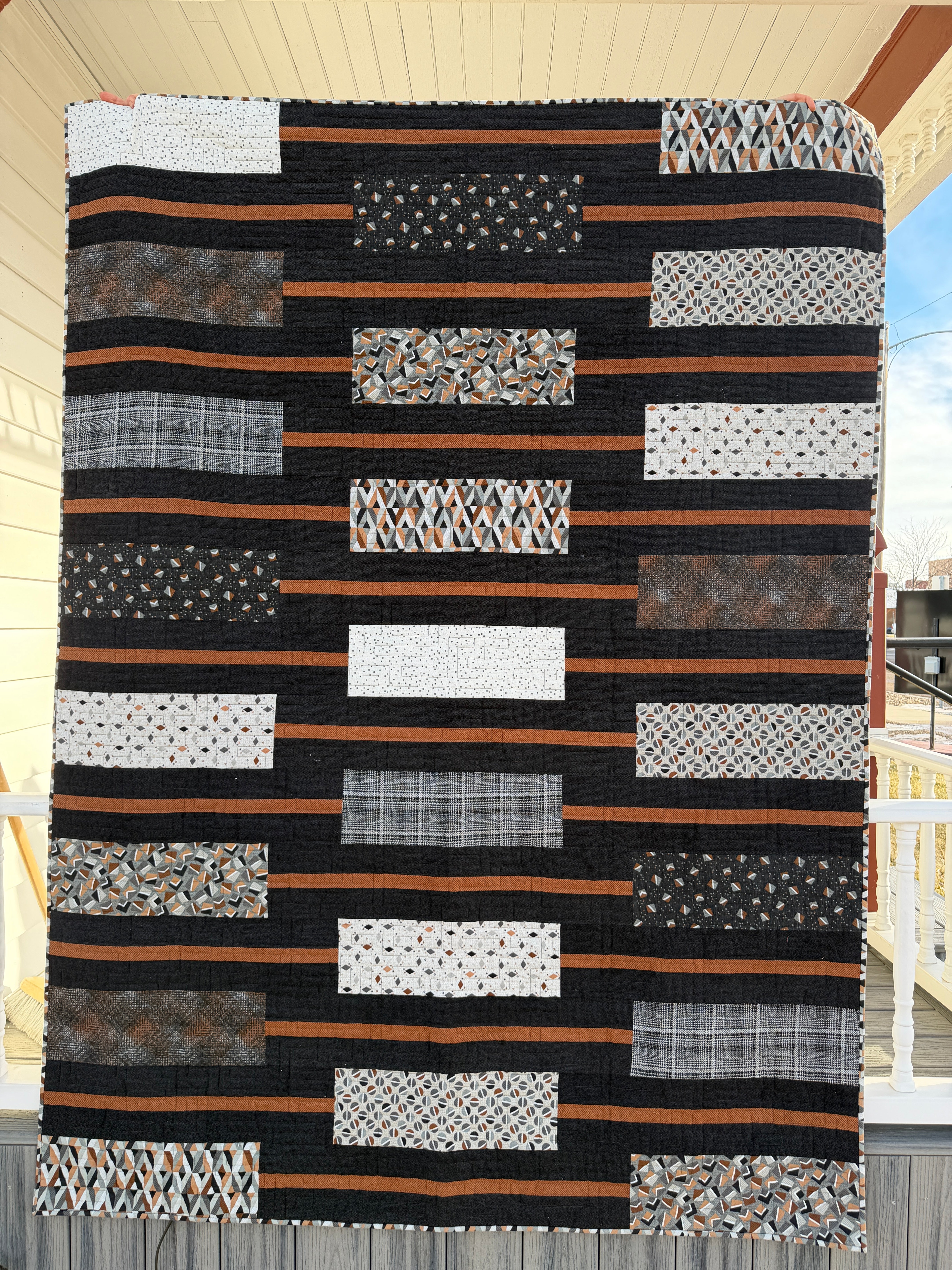This cozy flannel quilt combines modern patchwork with a warm, masculine color palette.  Featuring layered horizontal striping in deep black and rich rust tones, the design is accented with textured geometric and plaid prints from the Haberdashery fabric collection from Northcott Fabrics