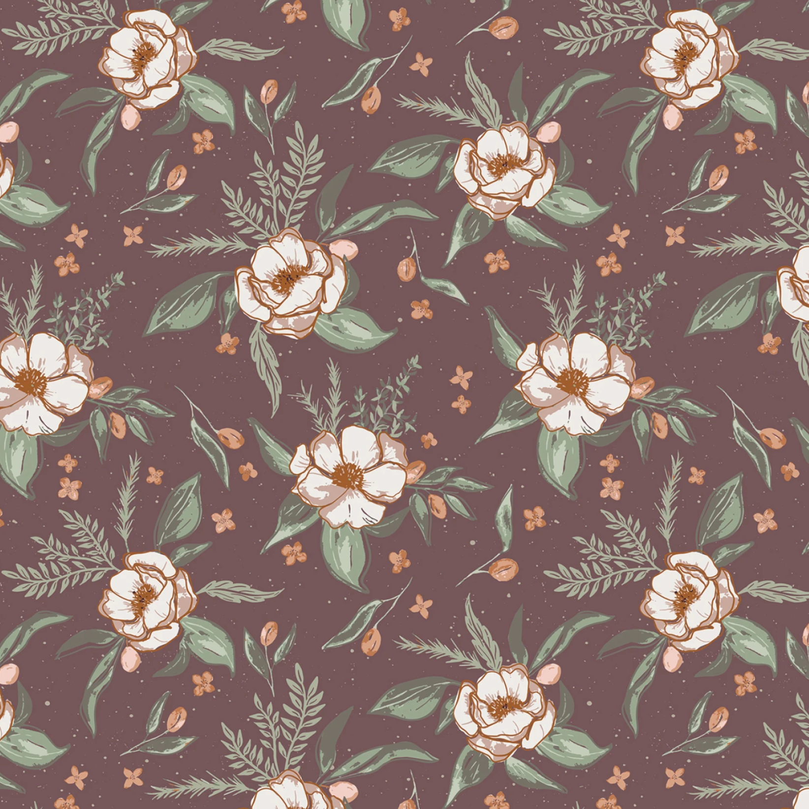 Vintage cream florals with olive leaves float on a rich plum ground.