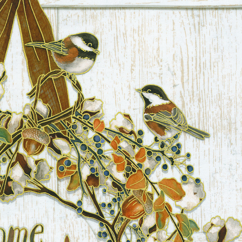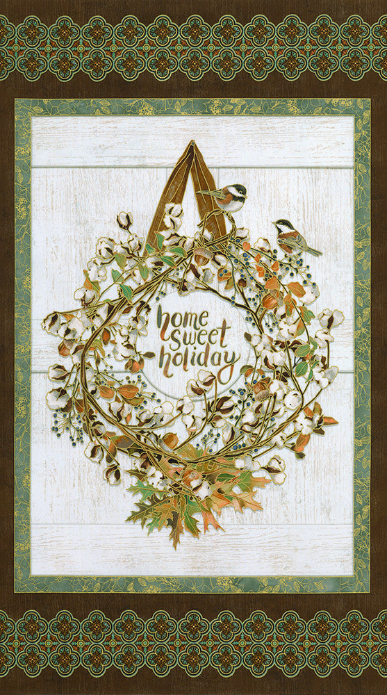 This 24” repeating panel features a charming cotton wreath adorned with chickadees, fall foliage, and the warm message “Home Sweet Holiday.” With elegant borders and a rustic woodgrain background, it’s ready to shine in seasonal wall hangings, table toppers, or festive quilts.