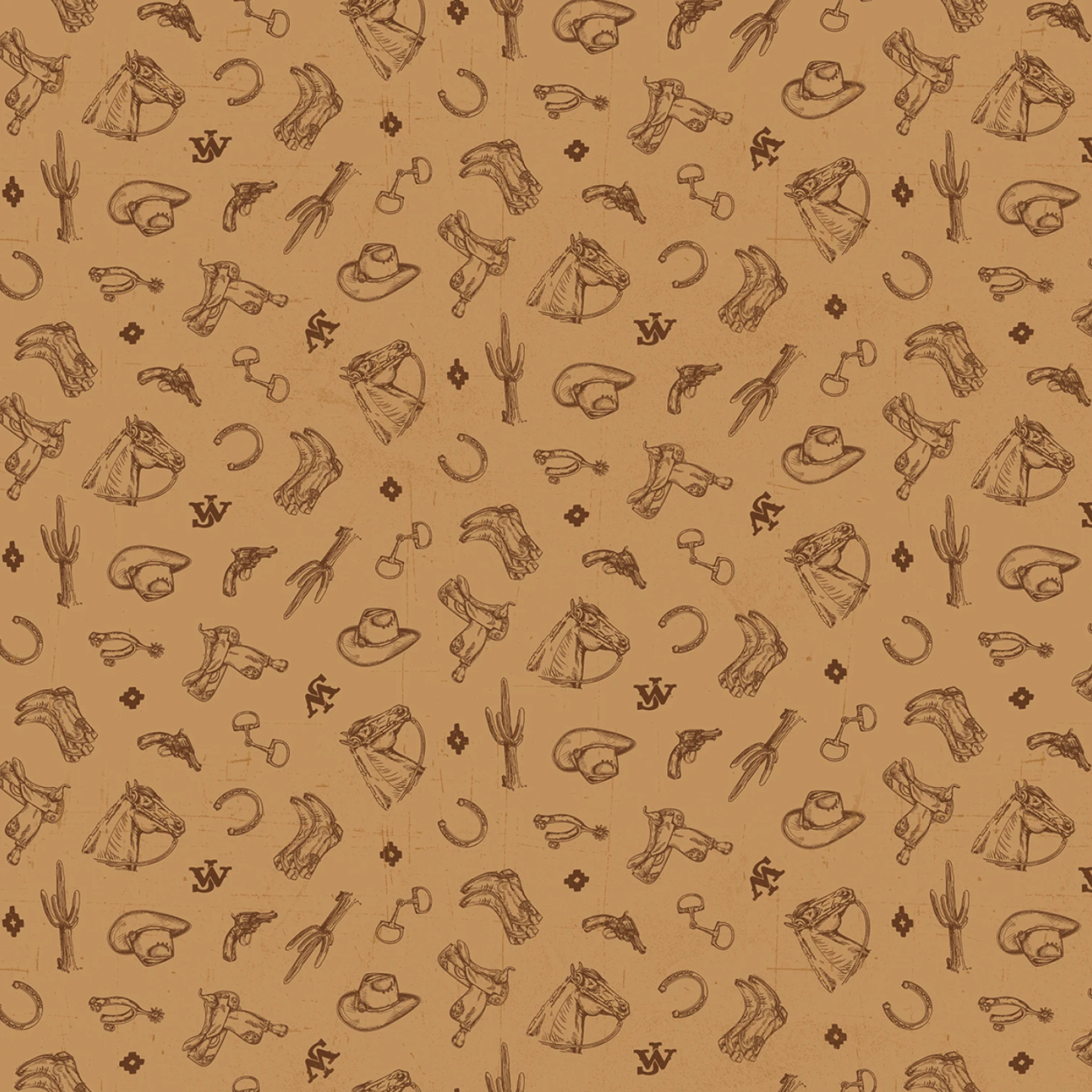 Boots, hats, lariats, spurs, and lucky horseshoes scattered on a sun-washed tan.