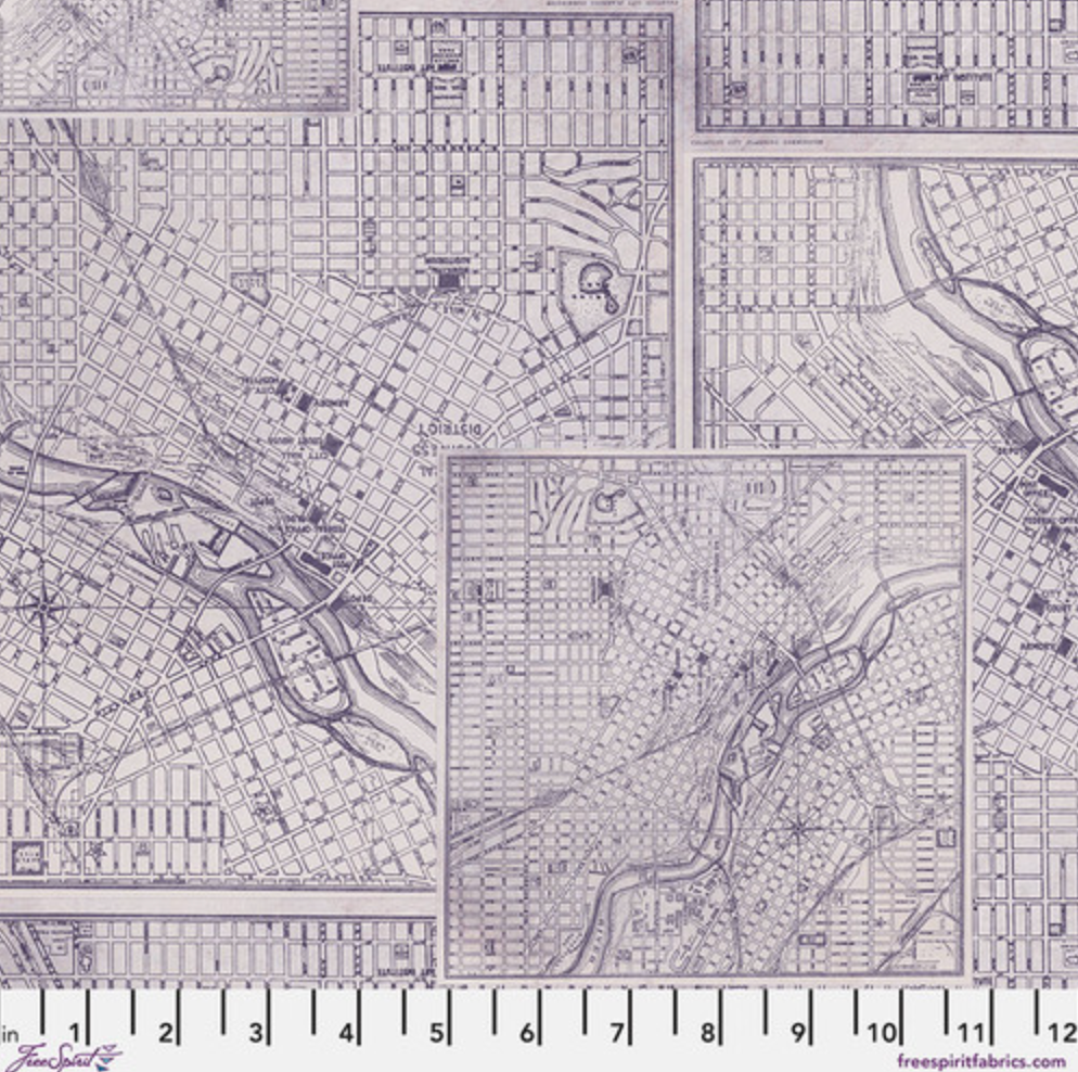Detailed cartographic designs in soft purple tones — like a treasure map printed on fabric. A striking choice for quilt backs, or for modern projects that crave timeless character.