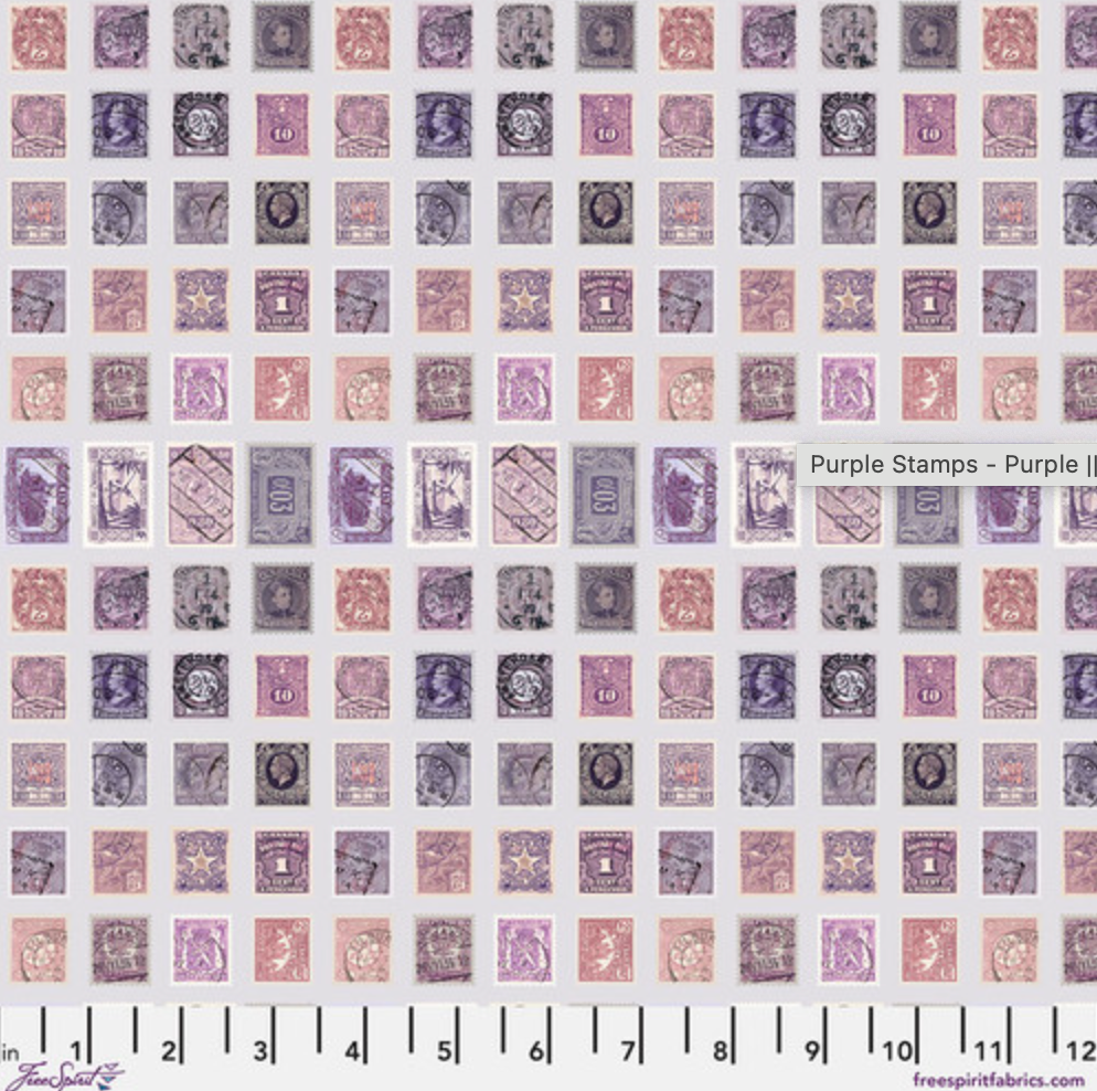 Rows of vintage postage stamps in shades of violet, lilac, and rose create a collector’s dream on fabric. Ideal for adding texture and charm to quilts, bags, or home décor projects.
