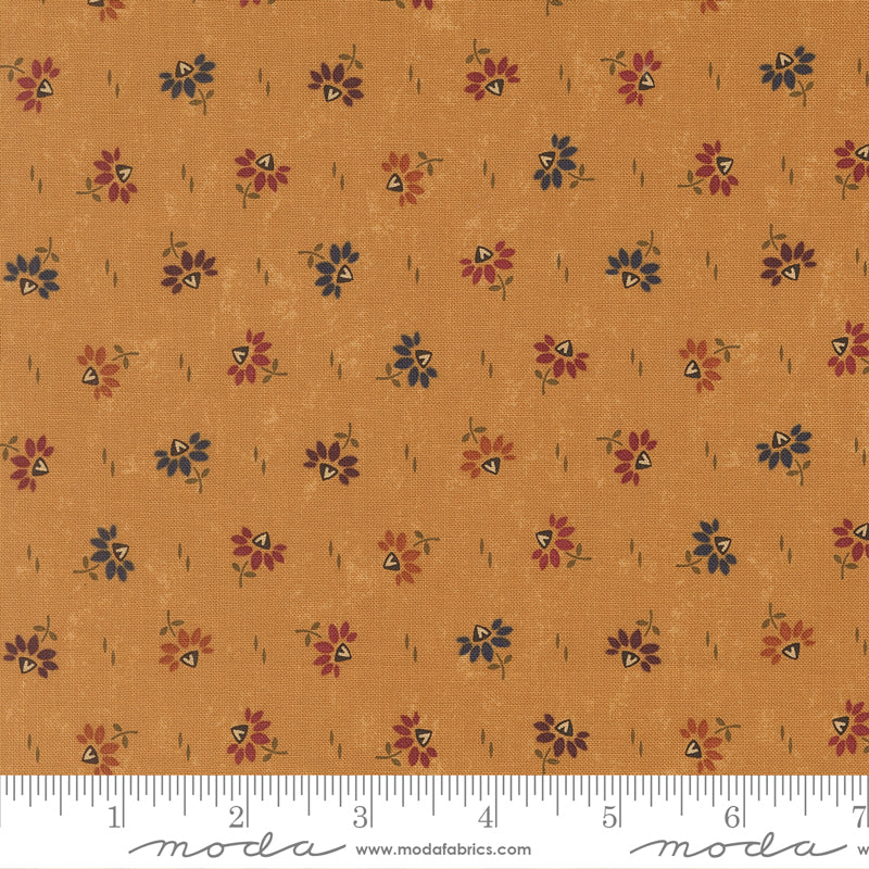 Tiny blossoms in shades of red, blue, and gold dot a honey-colored ground, bringing a cheerful pop of warmth and movement.
