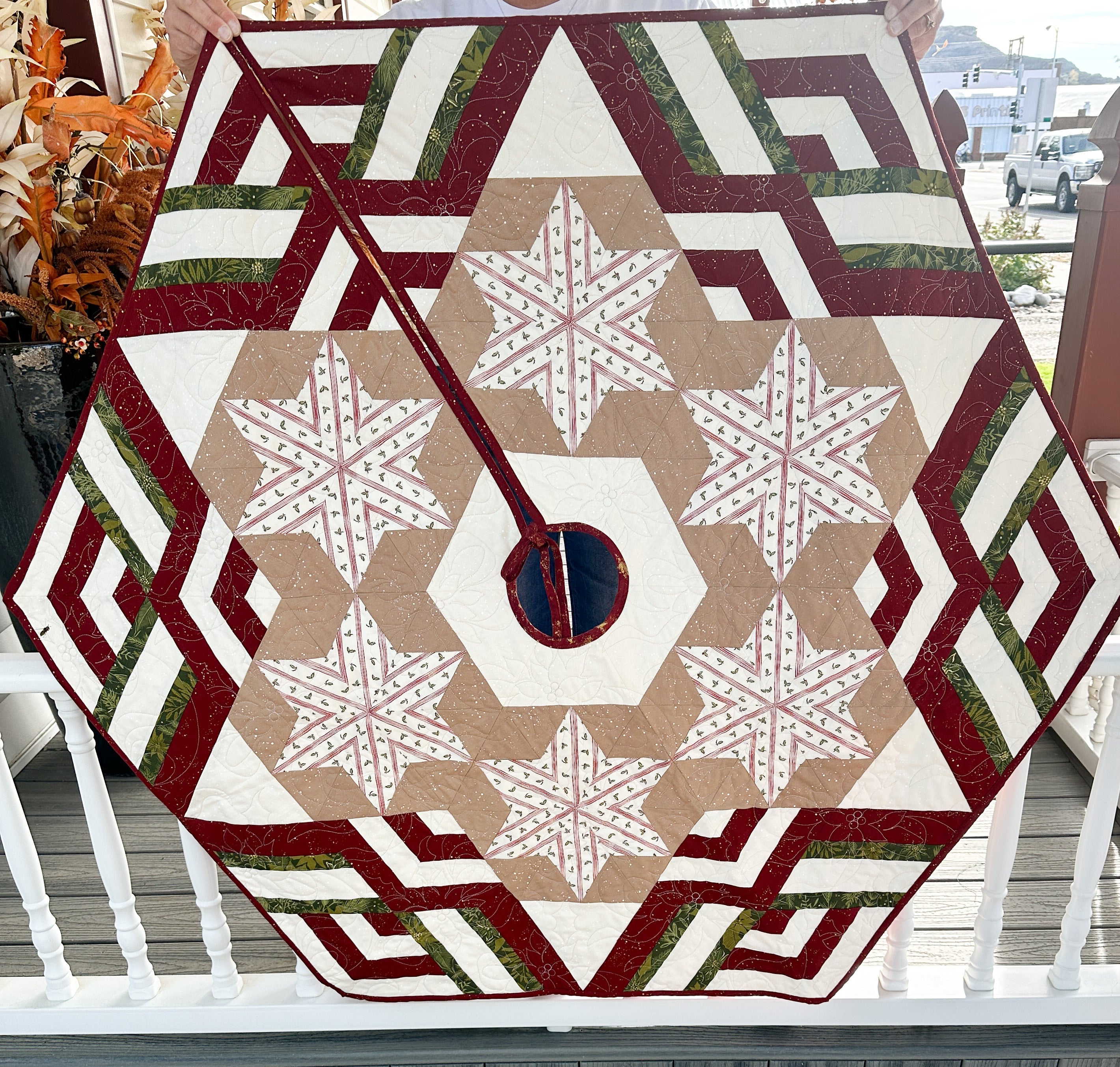 Add a touch of timeless elegance beneath your Christmas tree with Gilded. Designed in warm taupe, cranberry, and evergreen tones, this hexagon tree skirt blends modern geometry with classic holiday charm.