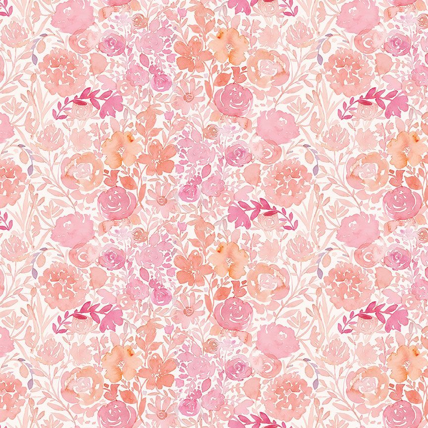 Watercolor florals in shades of blush, peach, and soft coral dance across a pale pink ground— romantic and dreamy.