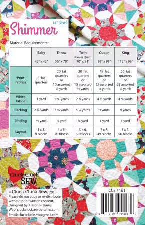Includes 5 sizes, Baby, Throw, Twin, Queen, and King. Fat Quarter friendly, no templates, no Y seams, and easy to follow color instructions. 14" finished block.