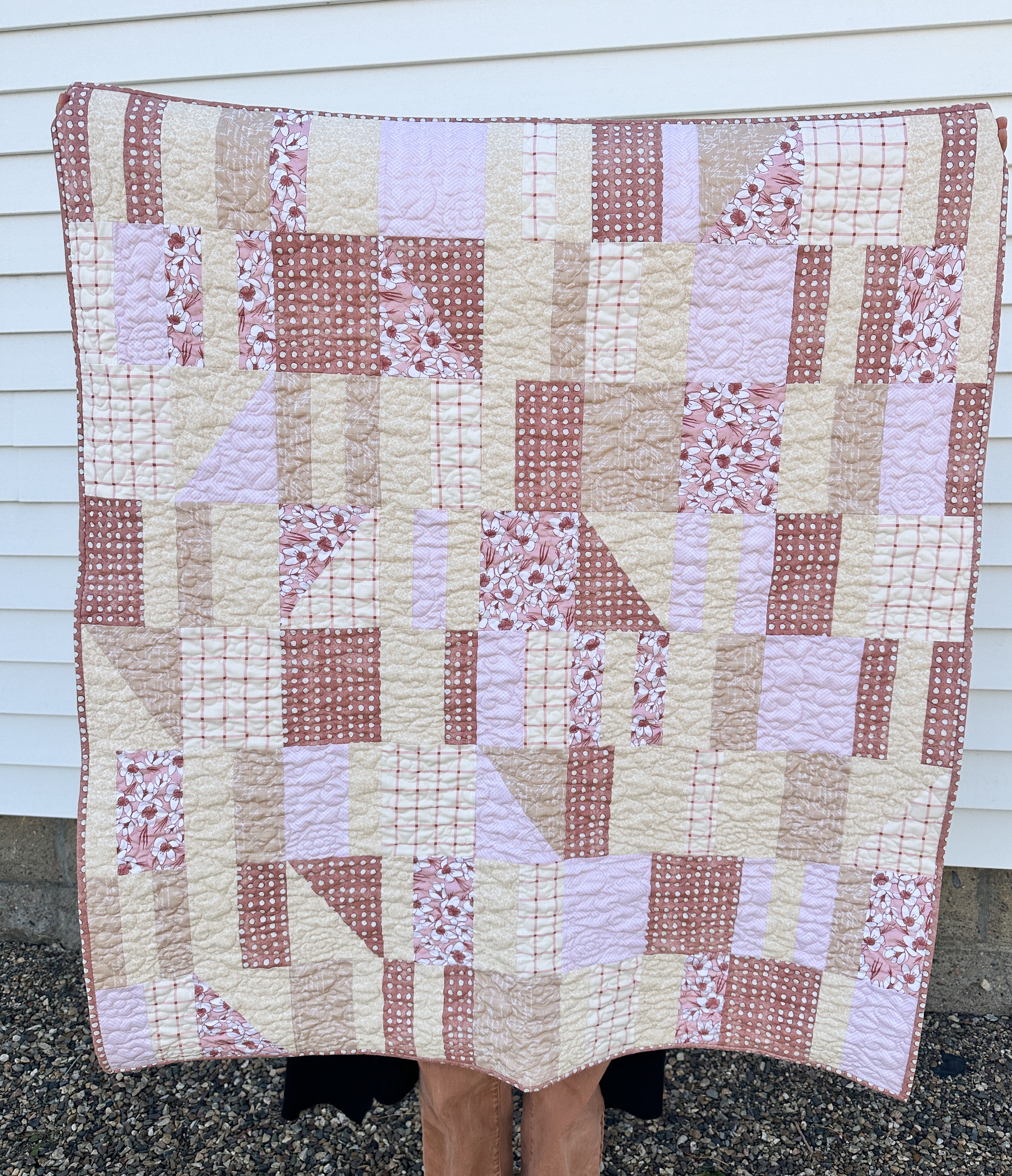 This quilt features a scrappy, modern patchwork design. The color palette of soft pinks and cream makes it perfect for the little girl in your life!