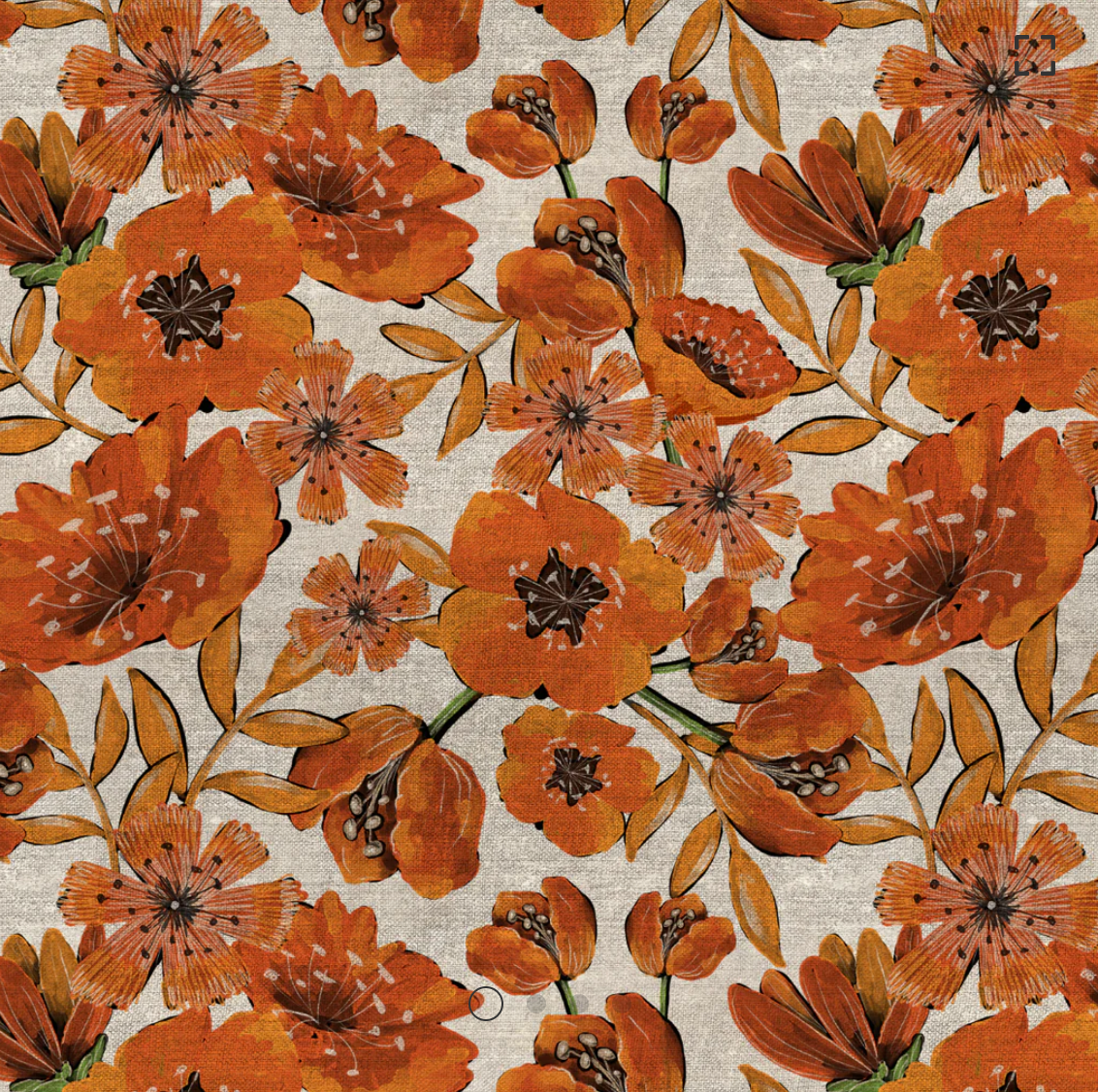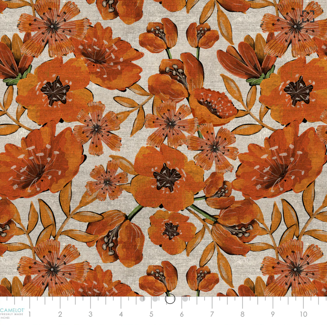 Bold orange blossoms burst across a textured linen-look background, their painterly petals paired with golden leaves for a warm, autumn glow. Perfect for seasonal quilts, table runners, and statement borders.